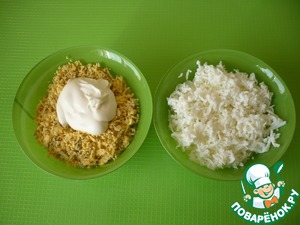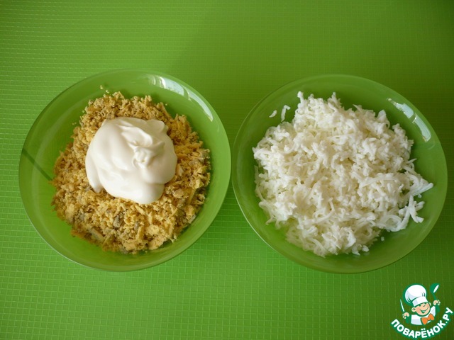 Теперь возьмите вареные куриные яйца почистите и разделите их на белки и желтки. По отдельности натрите их на мелкой терке в разные миски. В желтки добавьте по вкусу майонез и перемешайте.