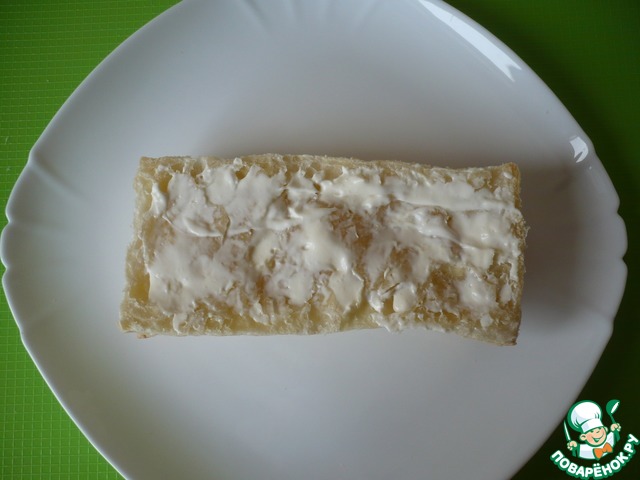 Затем положите сверху корж из слоеного теста, прижмите его и смажьте сверху майонезом.