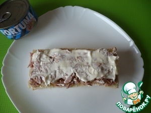 Первым слоем начинки будет тунец. Я использовала тунец полосатый рубленый ТМ FORTUNA. Предварительно слейте жидкость из консервированного тунца. Выложите равномерно по всей поверхности коржа.