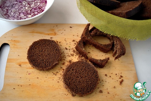 Лук измельчаем, заливаем кипятком, добавляем уксус, оставляем примерно на 10 минут и затем сливаем воду. Из ломтиков хлеба (у меня бородинский) вырезаем формой (у меня кольцо) кружочки.