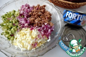 Яйца отвариваем, охлаждаем и нарезаем мелким кубиком. Огурец нарезаем тоже мелким кубиком. Консервированный тунец отделяем от заливки. В миску добавляем репчатый лук и майонез, смешиваем все ингредиенты. Солим и перчим по своему вкусу.