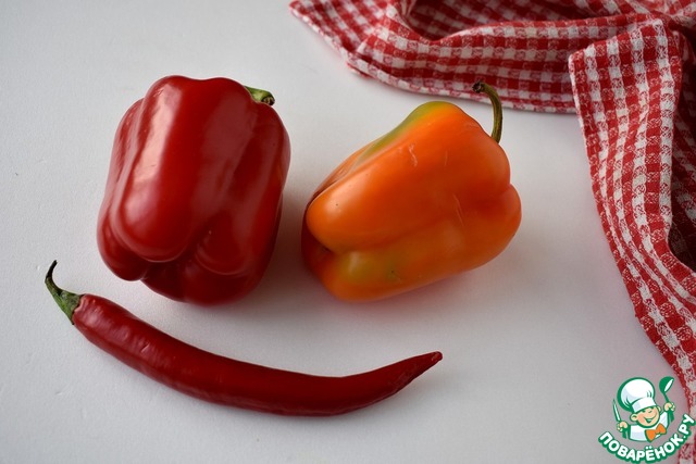 Для более эффектной подачи можно подобрать сладкие перцы разного цвета. Для любителей острого добавим перчик чили.