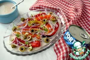 Посыпаем нарезанным красным луком и оливками.