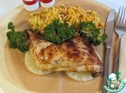 Подают окорочка на ломтиках ананаса. На гарнир подавала рис с ананасом и кокосовым молоком, отличный тандем!
