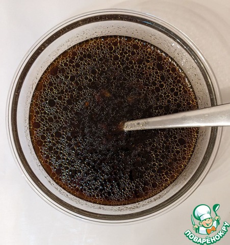 Приготовить маринад: смешать ананасовый консервированный сок (без сахара), соевый соус, кетчуп, добавить табаско, кунжутное масло, сахар и чеснок с имбирём. Размешивать до растворения сахара. Я не стала долго мешать, отлила немного сока в сахар и прогрела на 250 ватт 1 минуту в СВЧ.