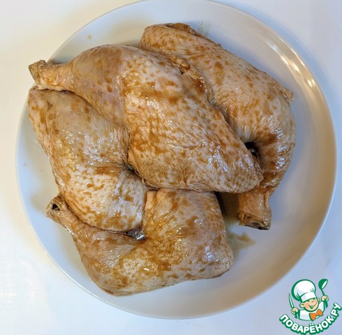 Залить окорочка маринадом и убрать в холодильник на 3-4 часа или дольше.