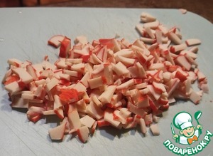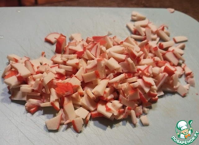 Крабовое мясо мелко нарезать или натереть на крупной тёрке