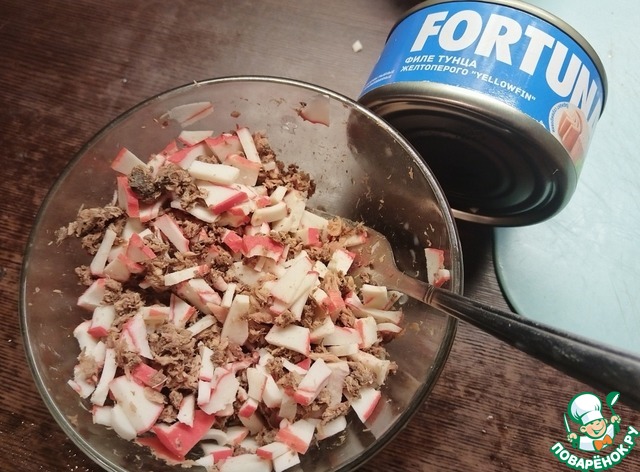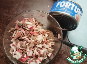 С консервированного тунца ТМ FORTUNA слить жидкость, рыбку размять вилкой. Смешать с крабовым мясом