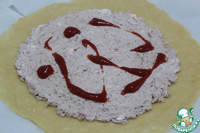 Отжатый тунец смешать с творожным сыром, сметаной, перцем и выложить на тесто, не доходя до краев.