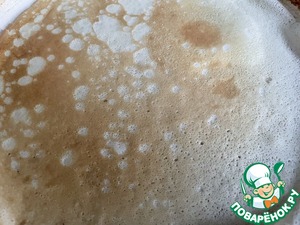 Выпекайте тонкие блинчики. Из этого количества теста получается 8 штук, у меня сковорода диаметром 24 см.