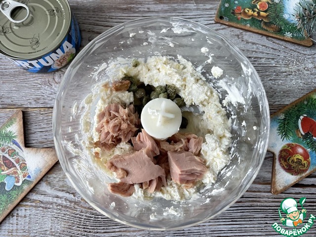 Добавьте филе тунца и каперсы. Пробейте блендером, чтобы остались кусочки тунца и кусочки каперсов, в паштет сбивать не надо. Текстура у риета должна быть фактурной.