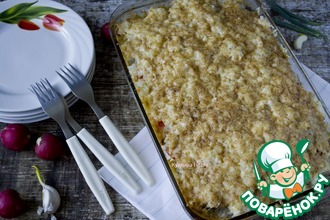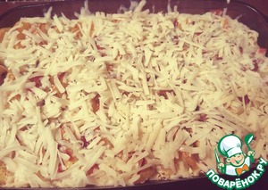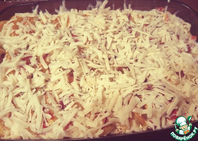 Сыр натереть на терке и выложить поверх готовой запеканки. Посыпать пряностями. Поставить в духовку на 3-5 мин.