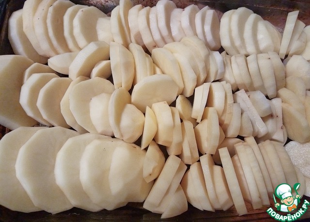 Картофель очистить и нарезать на пластики толщиной 3мм. Выложить в форму для запекания "на ребро"