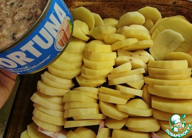 Консервированный тунец ТМ FORTUNA слегка размять вилкой, чтобы остались небольшие кусочки. Рыбу вместе с жидкостью выложить на картофель. Нужно, чтобы рыбка попала между картофелинами. Так будет вкуснее, нежели если она будет лежать слоем сверху.