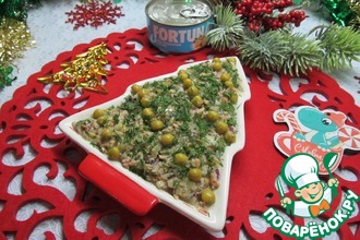 • Добавляем тунец без жидкости, предварительно измельчив его на небольшие кусочки. Аккуратно перемешиваем. У меня тунец ТМ FORTUNA.