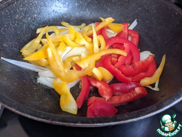 • Обжариваем на растительном масле лук около 2 минут, добавляем перец, перемешиваем.