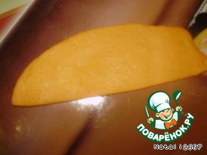 Листы капусты я делала так: взять кусочек теста, скатать в шарик и раскатать в овальную форму. Разрезать пополам.