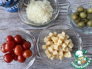 Подготовьте продукты для пасты. Оливки нарежьте колечками, твердый сыр натрите на мелкой терке (отлично подойдет пармезан). Сыр, который помягче, нарежьте ровными кубиками.