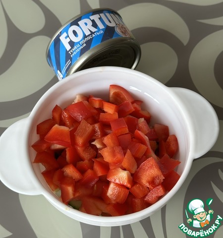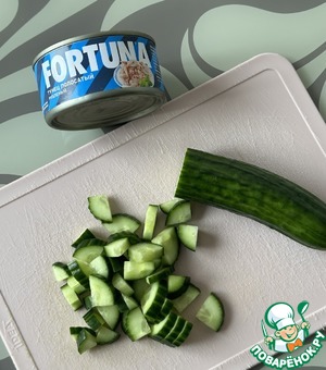 Теперь добавить тунец. Я использовала тунец полосатый рубленый ТМ «FORTUNA», банка 185 граммов, нужна половина банки.