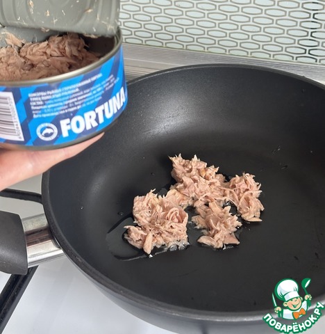 Пока варится птитим, приготовим тунец. Я использовала тунец ТМ «Fortuna» полосатый рубленый.