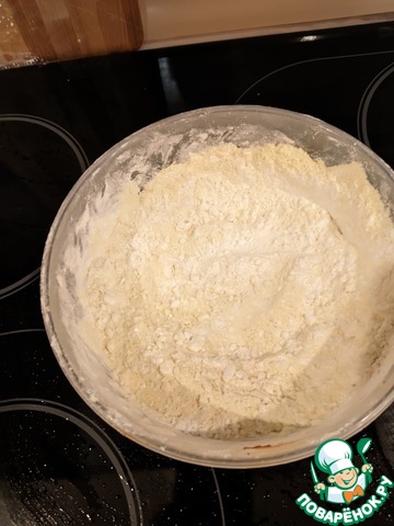 В миску, насыпьте 50/50 муки и крахмала, добавьте 1/3 ч. л. эмульгатора