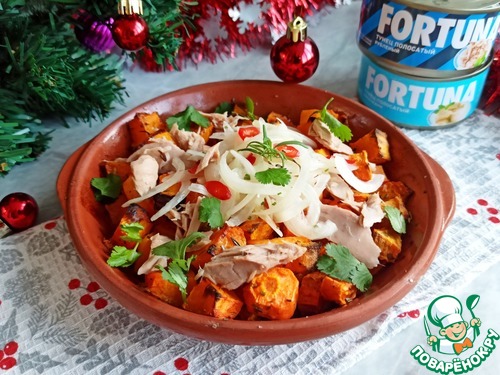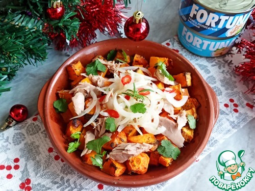 Очень приятный салат! Запеченные тыква, батат и морковь по вкусам и даже по цвету сочетаются друг с другом. Пряный, хрустящий лук добавил остроты, сочности и яркого вкуса. А консервированный тунец FORTUNA в салате - это сытность и пикантность, он очень гармонично вписался в общий состав.