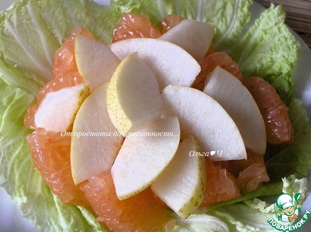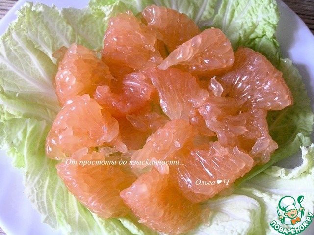 Листья пекинской капусты порвите руками и разложите по тарелкам, сверху выложите очищенные от пленок кусочки грейпфрута.
