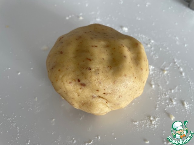 Для теста измельчить на мясорубке орехи и смешать их с сыпучими ингредиентами, добавить размягченное сливочное масло и желтки. Хорошо вымешать.