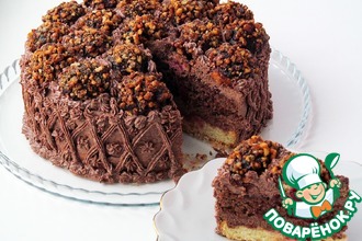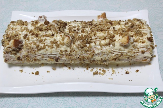 Вилкой по крему сделать бороздки и посыпать орехами.