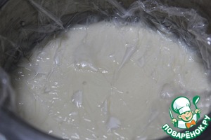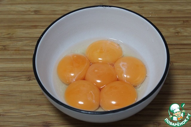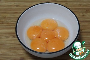 Затем на небольшой скорости добавить во взбитые белки по одному желтки, взбивая после каждого желтка.