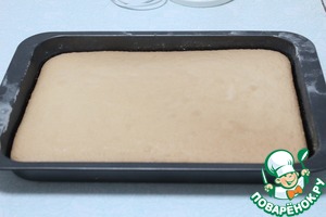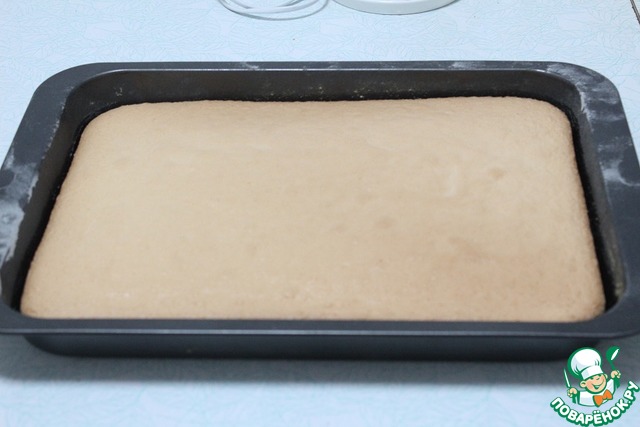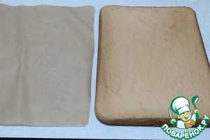 Разрезать бисквит пополам и верхнюю часть выложить на пергамент разрезом вверх.