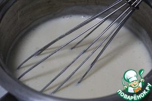 Молоко влить в сотейник, добавить желтки, крахмал и хорошо размешать венчиком.