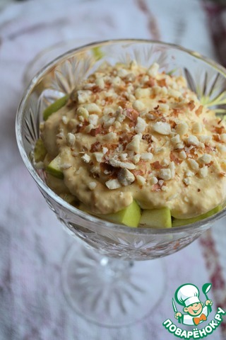 Яблочный слой полить оставшимся кремом. Сверху посыпать измельчённым арахисом.
