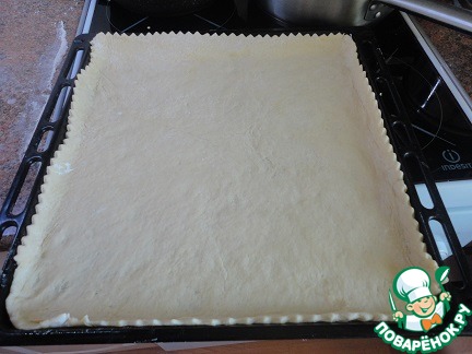 Для теста соединить все ингредиенты. Получается очень мягкое, податливое тесто. Раскатать его и выложить на стандартный противень с небольшими бортиками. Выложить начинку.