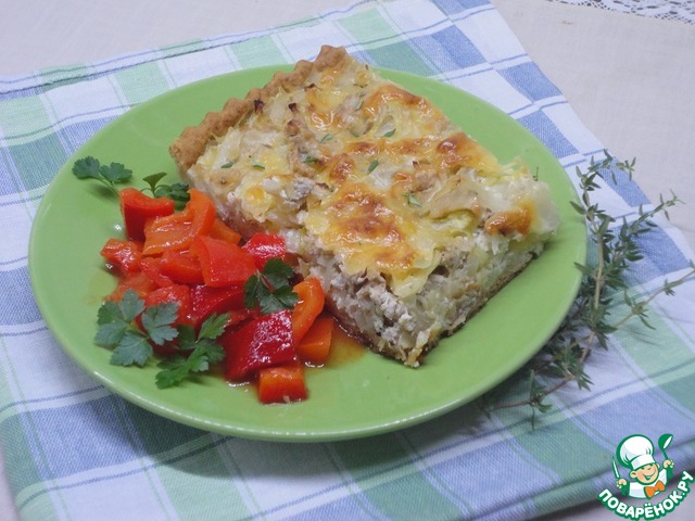 Для заливки смешать яйцо, сметану и натертый на крупной терке сыр. Не солить. Вылить заливку на пирог.