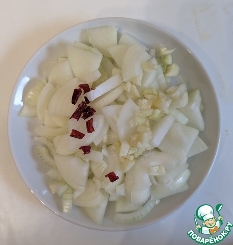 • В разогретом арахисовом масле слегка поджарить лук, чеснок и чили.
