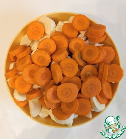 • Добавить пастернак и морковь, залить водой, чтобы она покрывала овощи, довести до кипения и варить до готовности овощей, минут 15-20.