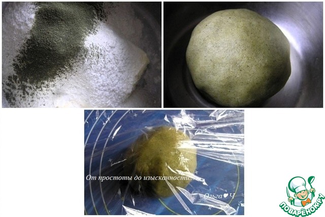 Приготовьте песочное тесто с чаем матча. Для этого смешайте размягченное сливочное масло с сахаром, мукой и чаем матча, добавьте желток. Замесите тесто, накройте пленкой и уберите в холодильник на полчаса.