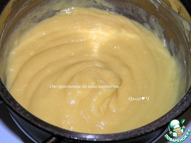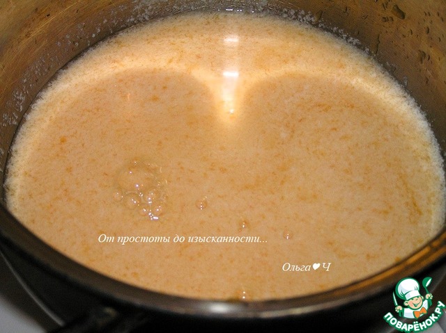 А пока приготовьте апельсиновый заварной крем. В кастрюльку влейте молоко, добавьте сахар, перемешайте. Влейте апельсиновый сок, добавьте ванилин, цедру, яйцо и немного взбейте.