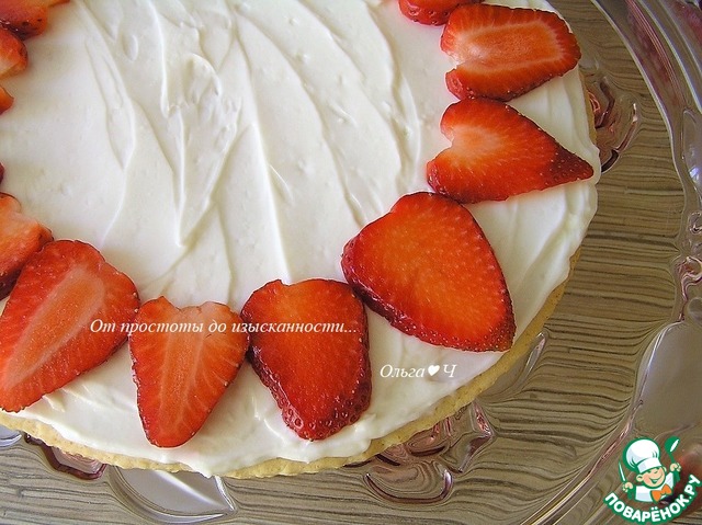 На остывшую основу для пиццы выложите крем, разровняйте. По кругу от края выложите клубнику, выбирая крупные ломтики.