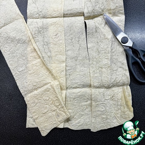 Ножницами нарезаем лаваш полосками, примерно 10 на 40 см.