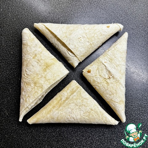 Аккуратно сворачиваем лаваш в треугольнички, как показано на фото. Все края закрыты, начинку немного прижимаем, лишнее тесто срезаем.