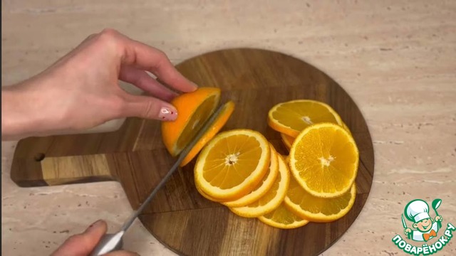 После того как сироп закипит, добавляем апельсины, после того как сироп закипит еще раз, выключаем огонь и даем ему остыть. -