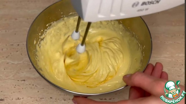 5 желтков и 20 граммов сахара взбиваем миксером, масса должна увеличиться в объеме и стать светлой.