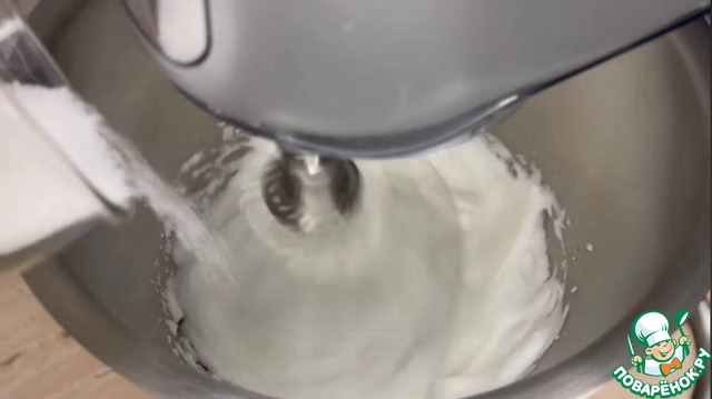 В отдельной чаще взбиваем белки до пышной пены, после чего маленькими порциями добавляем сахар,150 граммов + 10 граммов ванильного.