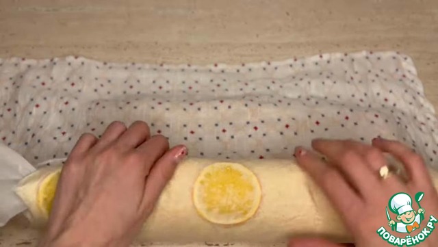Еще горячий бисквит накрываем влажным полотенцем и скручиваем в рулет.