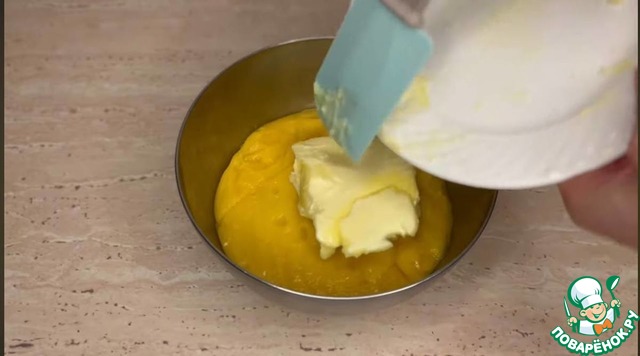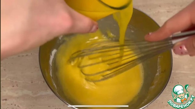 Маленькими порциями вливаем горячий апельсиновый сок и интенсивно мешаем венчиком, что бы желтки не свернулись. -
