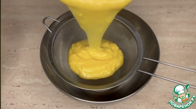 Пропускаем крем через сито, что бы не было комочков, накрываем пленкой в контакт и даем остыть.