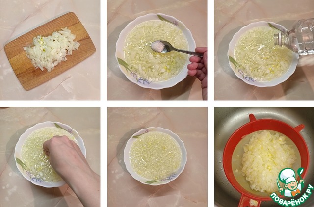 Лук очистить и мелко нарезать. Переложить его в глубокую миску, залить теплой водой, добавить соль, сахар, уксус, немного помять руками и отставить в сторону на 15-20мин, чтобы он замариновался. Затем маринад слить, а готовый лук хорошо отжать руками от лишней жидкости.