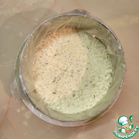 На лук равномерно распределить слой сыра, натертого на мелкой терке. Сверху сделать сеточку из майонеза.